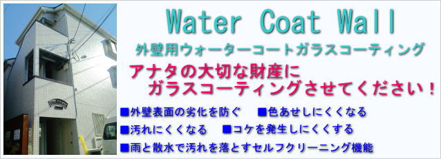 このアパートに塗布した遮熱塗料「アドグリーコート」も例外ではありません。 効能通り15年効果が持続したとしても、また一般塗料と同様塗替えは必至です。 そこでご提案させていただいたプランがガラスコーティングです。 建物用ウォーターコートガラスコーティングは、確実に2倍は塗面の劣化を防ぐ事が証明されています。 特殊塗料効果の劣化も同様に防いでくれます。 |